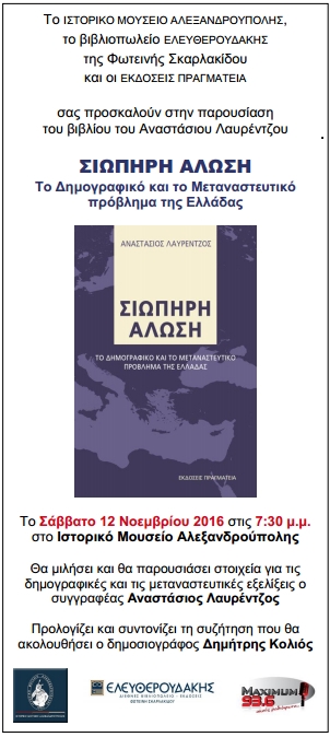 Το Ιστορικό Μουσείο Αλεξανδρούπολης και το βιβλιοπωλείο Ελευθερουδάκης - Φ. Σκαρλακίδου, οργανώνουν δημόσια συζήτηση-παρουσίαση του βιβλίου «ΣΙΩΠΗΡΗ ΑΛΩΣΗ – Το Δημογραφικό και το Μεταναστευτικό πρόβλημα της Ελλάδας» του Αναστάσιου Λαυρέντζου το Σάββατο 12 Νοεμβρίου 2016 στις 19:30 μ.μ στο Ιστορικό Μουσείο Αλεξανδρούπολης.