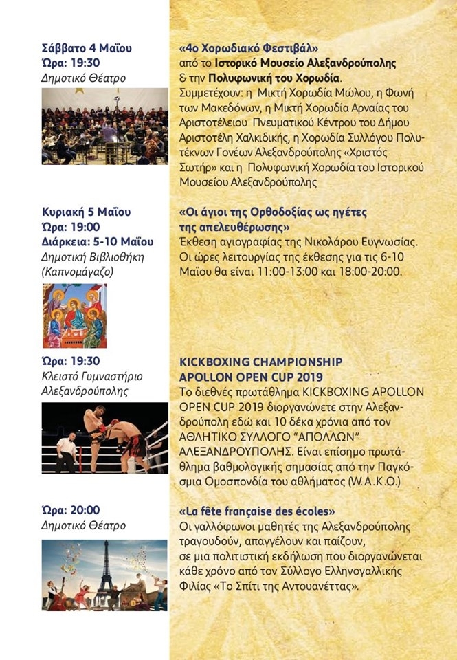 Από τις 4 Μαϊου μέχρι τις 19 Μαΐου 2019 θα πραγματοποιηθούν οι εορταστικές εκδηλώσεις για τα "Ελευθέρια" της Αλεξανδρούπολης. Πρόκειται για την 99η επέτειο της απελευθέρωσης της πόλης και της ενσωμάτωσής της στον εθνικό κορμό.