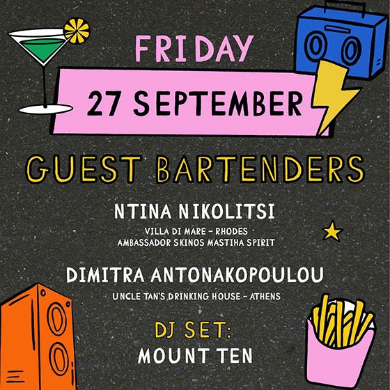 - Η Ντίνα Νικολίτση, από το "Villa Di Mare" της Ρόδου και πρέσβειρα του Skinos Mastiha Spirit, θα δημιουργήσει αυθεντικά, δροσερά κοκτέιλ μαζί με την Δήμητρα Αντωνακοπούλου, από το "Uncle Tan’s Drinking House" της Αθήνας και θα προσφέρουν γεύσεις που ξεπερνούν τα όρια της φαντασίας.