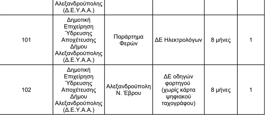 Ανακοινώθηκε η πρόσληψη, με σύμβαση εργασίας ιδιωτικού δικαίου ορισμένου χρόνου, συνολικά τριών (3) ατόμων για την κάλυψη εποχικών ή παροδικών αναγκών της Δημοτικής Επιχείρησης Ύδρευσης Αποχέτευσης Δήμου Αλεξανδρούπολης, που εδρεύει στην Αλεξανδρούπολη και συγκεκριμένα του εξής, ανά υπηρεσία, έδρα, ειδικότητα και διάρκεια σύμβασης, αριθμού ατόμων, με τα αντίστοιχα απαιτούμενα: