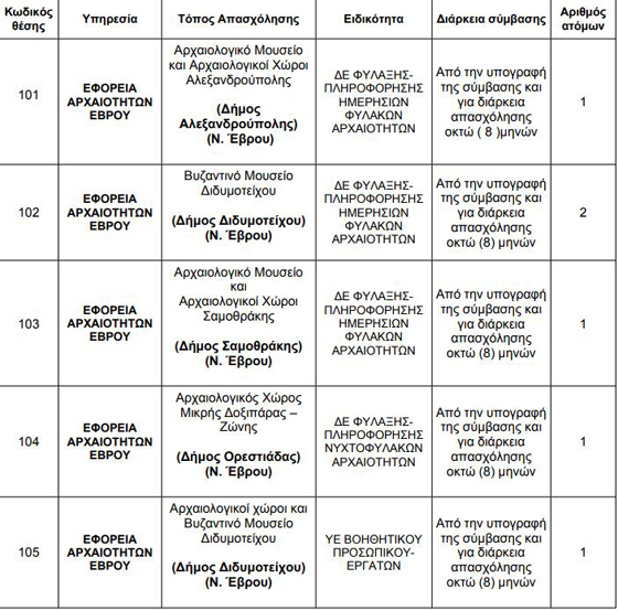 Η Εφορεία Αρχαιοτήτων Έβρου ανακοινώνει την πρόσληψη, με σύμβαση εργασίας ιδιωτικού δικαίου ορισμένου χρόνου, συνολικά έξι (6) ατόμων για την κάλυψη εποχικών ή παροδικών αναγκών της Εφορείας Αρχαιοτήτων Έβρου, που εδρεύει στην Αλεξανδρούπολη και συγκεκριμένα του εξής, ανά υπηρεσία, τόπο απασχόλησης, ειδικότητα και διάρκεια σύμβασης, αριθμού ατόμων: