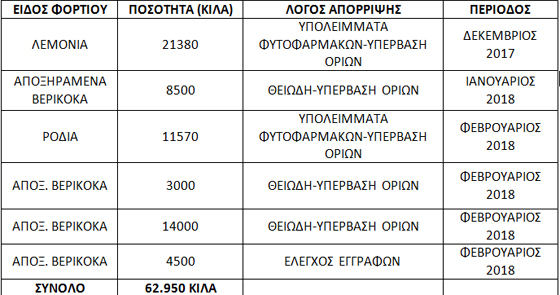 Η Περιφέρεια Ανατολικής Μακεδονίας και Θράκης - Περιφερειακή Ενότητα Έβρου ανακοίνωσε ότι κατά τους μήνες Δεκέμβριο 2017, Ιανουάριο και Φεβρουάριο 2018 οι Γεωπόνοι ελεγκτές της Διεύθυνσης Αγροτικής Οικονομίας και Κτηνιατρικής Έβρου στο τελωνείο Κήπων προέβησαν στη δέσμευση και απόρριψη φορτίων με προϊόντα προέλευσης Τουρκίας, συνολικής ποσότητας 63 τόνων περίπου, μετά από τακτικούς και έκτακτους ελέγχους που πραγματοποίησαν.