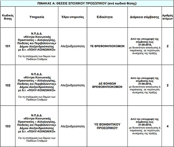 Την πρόσληψη, με σύμβαση εργασίας ιδιωτικού δικαίου ορισμένου χρόνου, συνολικά οκτώ (8) ατόμων ανακοίνωσε το Κέντρο Κοινωνικής Προστασίας – Αλληλεγγύης, Παιδείας και Περιβάλλοντος του Δήμου Αλεξανδρούπολης, το γνωστό Πολυκοινωνικό, για την υλοποίηση της Πράξης "Εναρμόνιση Οικογενειακής και Επαγγελματικής Ζωής" που υπολοποιείται στο πλαίσιο Ευρωπαϊκού Προγράμματος.