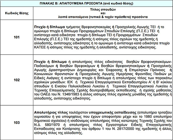 Τα αντίστοιχα απαιτούμενα (τυπικά και τυχόν πρόσθετα) προσόντα είναι: