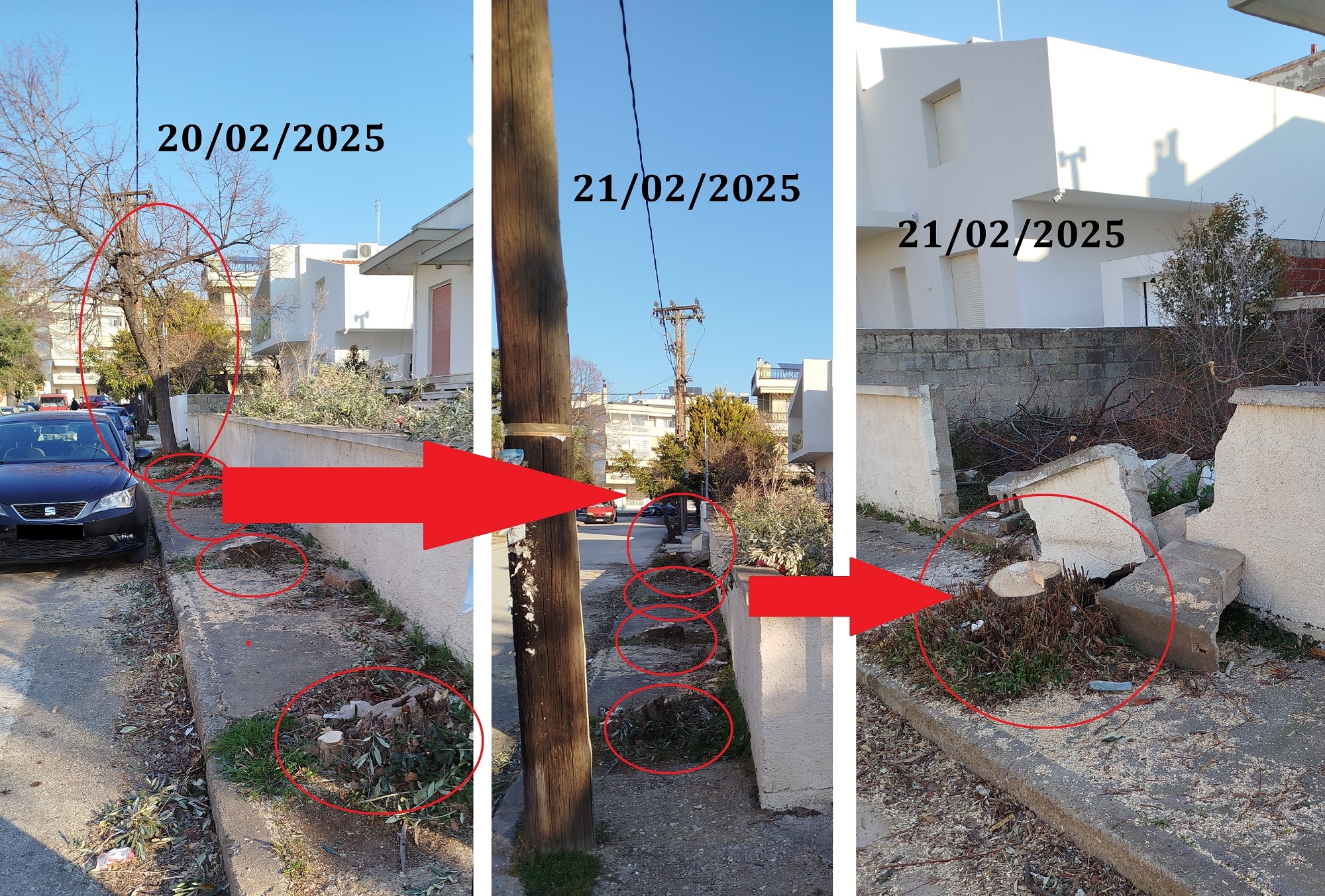 Στη συγκεκριμένη περίπτωση, όπως μας ενημέρωσαν περίοικοι, γίνονται εργασίες ανακαίνισης του ακινήτου και μέσα σε μία νύχτα, οι τέσσερις ελιές εξαφανίστηκαν. Την επόμενη μέρα κόπηκε άλλο ένα δένδρο στο πεζοδρόμιο. Έτσι "άνοιξε" η πρόσοψη του ακινήτου, αλλά δεν απελευθερώθηκε και το πεζοδρόμιο, αφού οι ρίζες και οι τρύπες με τη βάση των κορμών παρέμειναν εκεί εμποδίζοντας τη διάβαση πεζών.