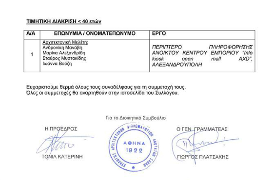 Το Open Mall AXD στην Αλεξανδρούπολη, (Περίπτερο πληροφόρησης ανοιχτού κέντρου εμπορίου "info kiosk open Mall AXD", απέσπασε το βραβείο αρχιτεκτονικής.