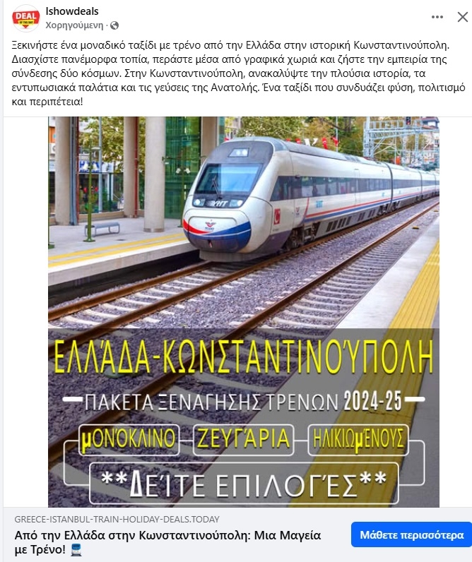 Οι επιτήδειοι που διακινούν τη διαφήμιση στο διαδίκτυο, γράφουν οτι οι ενδιαφερόμενοι μπορούν να κάνουν "ένα μοναδικό ταξίδι με τρένο από την Ελλάδα στην ιστορική Κωνσταντινούπολη. Διασχίστε πανέμορφα τοπία, περάστε μέσα από γραφικά χωριά και ζήστε την εμπειρία της σύνδεσης δύο κόσμων."