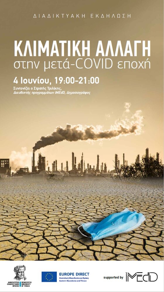 Το Δημοκρίτειο Πανεπιστήμιο Θράκης και η Επιτροπή Βιώσιμης Ανάπτυξης σε συνεργασία με το Europe Direct Ανατολικής Μακεδονίας-Θράκης, στο πλαίσιο της Παγκόσμιας Ημέρας Περιβάλλοντος, διοργανώνουν, την Παρασκευή 4 Ιουνίου και ώρα 19:00, διαδικτυακή εκδήλωση με τίτλο: «ΚΛΙΜΑΤΙΚΗ ΑΛΛΑΓΗ στην μετά-COVID εποχή».