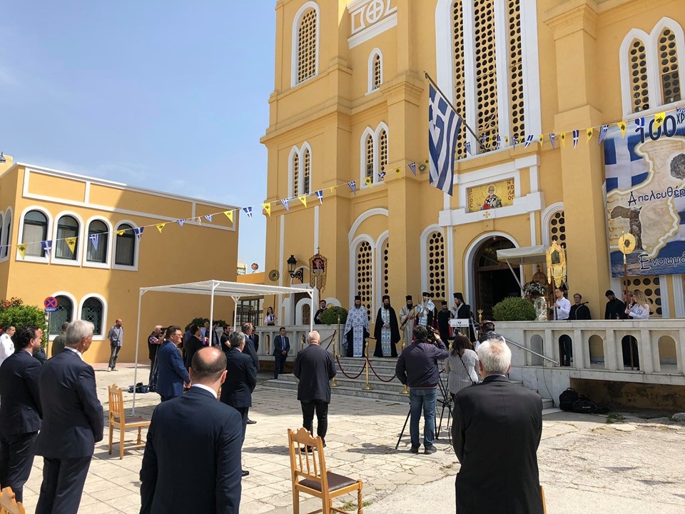 Αμέσως μετά πραγματοποιήθηκε στο προαύλιο χώρο του μητροπολιτικού ναού η επίσημη δοξολογία για πρώτη φορά χωρίς την παρουσία πιστών.