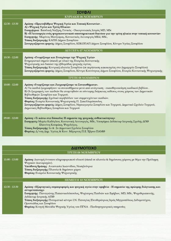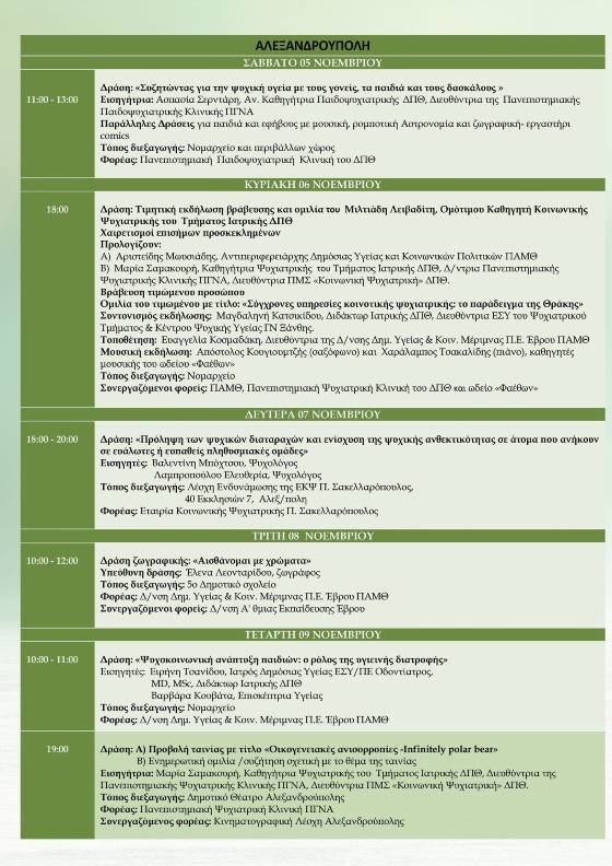 Η δράση περιλαμβάνει εκδηλώσεις σε όλες τις Περιφερειακές Ενότητες και αποτελεί μία σημαντική προσπάθεια διασύνδεσης και διαλόγου των φορέων ψυχικής και κοινωνικής υγείας της ευρύτερης περιοχής της Ανατολικής Μακεδονίας και Θράκης.