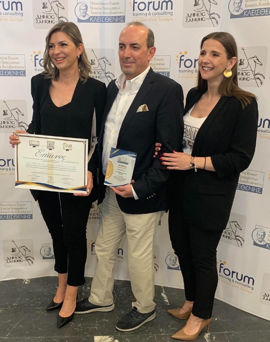 Η DASTERI A.E. βραβεύτηκε για το έργο και τη συνεισφορά της στον τομέα της ενέργειας και αποτέλεσε κομβικό φορέα στήριξης της επιτυχημένης διοργάνωσης του συνεδρίου. Την απονομή του βραβείου έκαναν ο Πρόεδρος της Ένωσης Γενικών Γραμματέων κ. Μιχάλης Χρηστάκης με τον Γενικό Γραμματέα του Δήμου Καλλιθέας κ. Νίκο Νικολακόπουλος ενώ το βραβείο παρέλαβε ο Πρόεδρος της εταιρίας DASTERI A.E. κ. Γιάννης Δαστερίδης ο οποίος σημείωσε μεταξύ άλλων «Να συγχαρώ τον Δήμο Ξάνθης, την Ένωση των Γενικών Γραμματέων ΟΤΑ και την FORUM. Είναι ένα συνέδριο που στέλνει τους δήμους προς καλύτερες οδούς. Εμείς τις φωτίζουμε . . . και οι Δήμοι να κάνουν το καλύτερο για να πάει η χώρα καλύτερα. Ευχαριστώ πολύ».