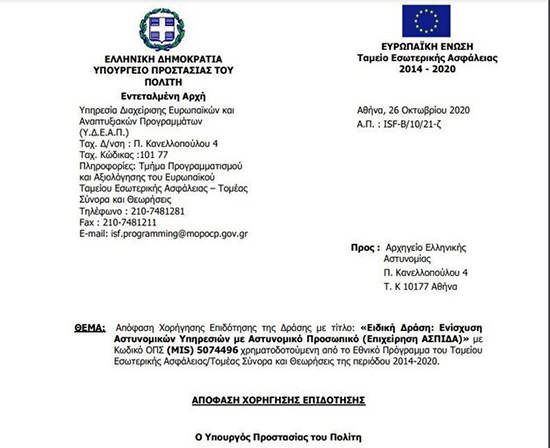 Δικαιούχος της επιδότησης είναι το αρχηγείο της ΕΛ.ΑΣ. Από τα 7,4 εκατομμύρια ευρώ, τα 6,7 εκατομμύρια ευρώ (δηλαδή το 90% του ποσού) χορηγούνται από την Ε.Ε. και συγκεκριμένα από το Ταμείο Εσωτερικής Ασφάλειας.