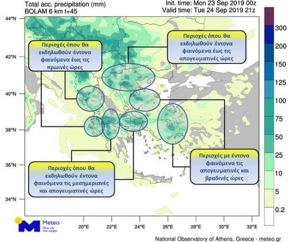 (Στο χάρτη που ακολουθεί παρουσιάζονται τα εκτιμώμενα αθροιστικά ύψη βροχής κατά τη διάρκεια της Τρίτης 24/09/2019. Με κύκλους επισημαίνονται οι περιοχές όπου αναμένονται τα ισχυρότερα φαινόμενα και πιθανόν χαλαζοπτώσεις).