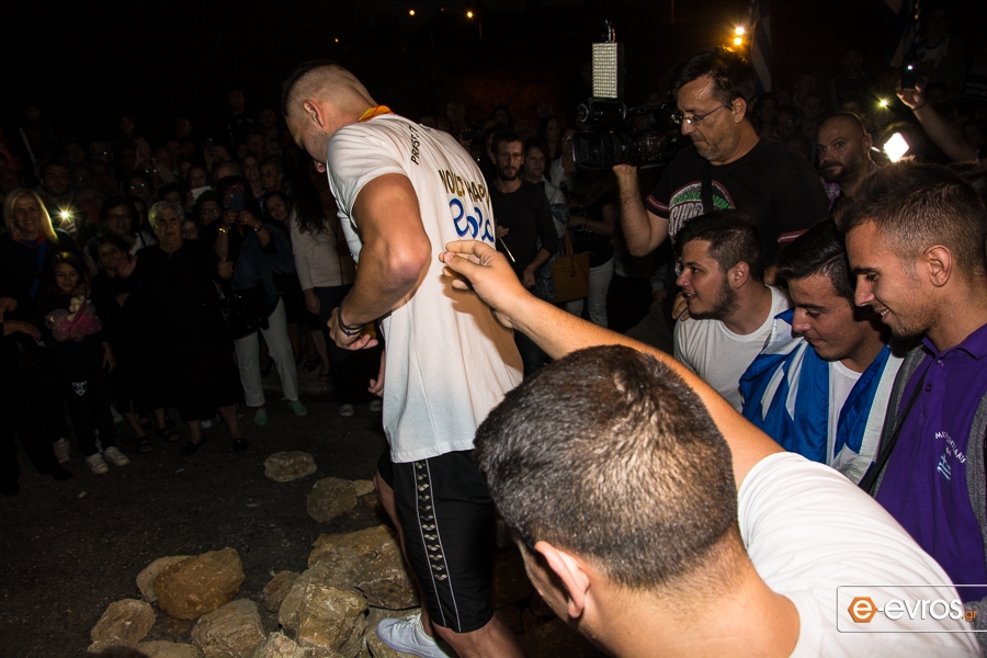 Με πλατύ χαμόγελο διαρκώς ο Δημοσθένης φορώντας στο κεφάλι χρυσοποίκιλτο. στεφάνι ελιάς, δεν αρνήθηκε να αγκαλιάσει, να φωτογραφηθεί και να μιλήσει σε όλους όσοι του το ζήτησαν. Στις 19:15 ο Δημοσθένης καταχειροκροτήθηκε στο χωριό Δορίσκος του Δήμου Αλεξανδρούπολης, όπου είναι και το χωριό καταγωγής του πατέρα του.