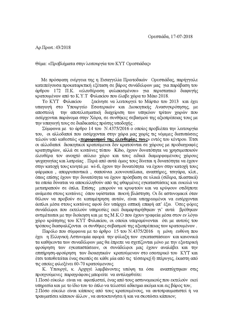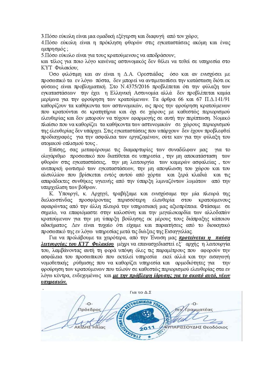 «Η μόνη ευθύνη που έχει η Ελληνική Αστυνομία αφορά την φύλαξη των εγκαταστάσεων και κανονικά τα καθήκοντα των συναδέλφων μας θα έπρεπε να σχετίζονται μόνο με την εξωτερική φρούρηση των εγκαταστάσεων, οι συνάδελφοι μας έχουν αναλάβει και την επιτήρηση-φρούρηση των διοικητικών κρατούμενων στο εσωτερικό του ΚΥΤ. (…) Μπορείτε να αντιληφθείτε πόσο εύκολο είναι να αφοπλιστεί, ένας από τους αστυνομικούς που εκτελούν εκεί υπηρεσία και με το ίδιο του το όπλο να τελεστεί αδίκημα ακόμα και εις βάρος του;», διερωτώνται μεταξύ άλλων οι αστυνομικοί.