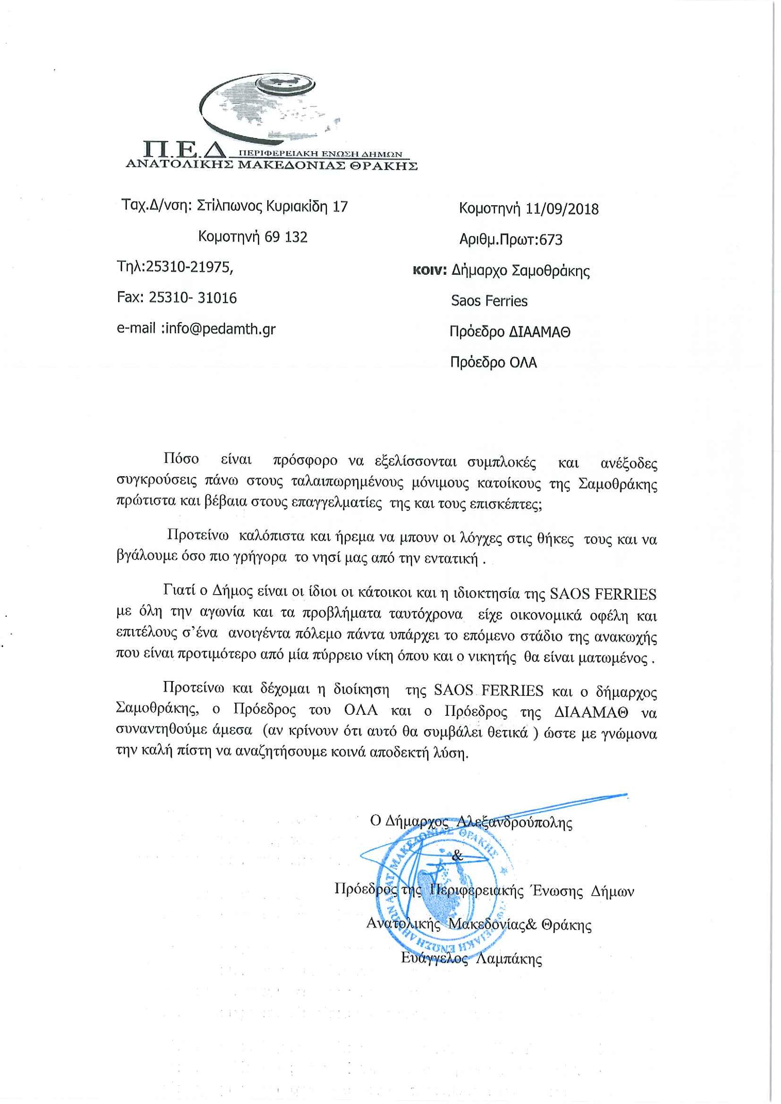 «Πόσο είναι πρόσφορο να εξελίσσονται συμπλοκές πάνω στους ταλαιπωρημένους μόνιμους κατοίκους της Σαμοθράκης;», διερωτάται ο Βαγγέλης Λαμπάκης, καλώντας αμφότερους τον πλοιοκτήτη της SAOS Ferries Φ.Μανούση και τον Δήμαρχο Θ.Βίτσα, να βάλουν «τις λόγχες στις θήκες τους, για να βγάλουμε το νησί μας από την εντατική».