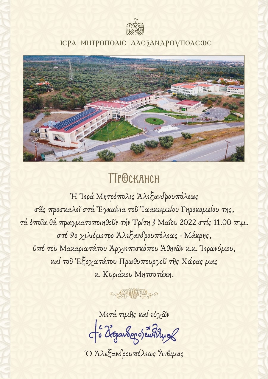 Η Ιερά Μητρόπολη Αλεξανδρούπολης μας προσκαλεί στα εγκαίνια του Ιωακειμείου Γηροκομείου της.
