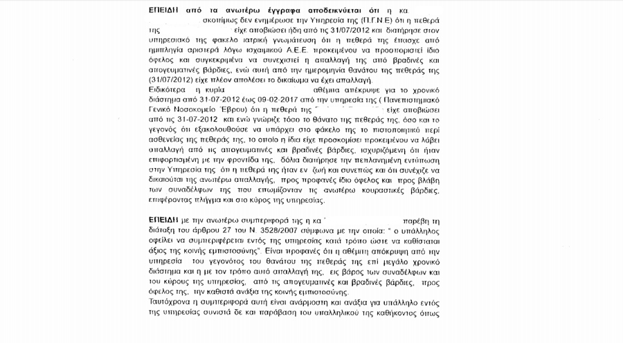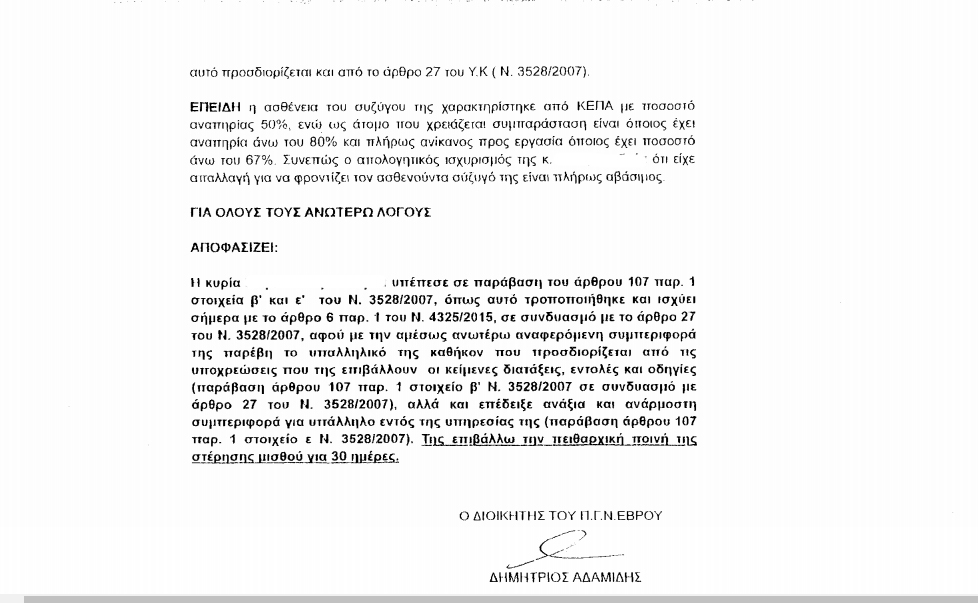 10/04/2017 ο Διοικητής του Νοσοκομείου της υπέβαλε πειθαρχική ποινή στέρησης μισθού για 30 ημέρες, επειδή δεν ενημέρωσε ότι πέθανε η πεθερά της.