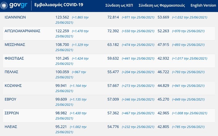 Σύμφωνα με την συγκεκριμένη υπηρεσία, μέχρι την Παρασκευή 25 Ιουνίου 2021 έχουν εμβολιαστεί στον Έβρο 100.744 άνθρωποι. Την πρώτη δόση του εμβολίου την έχουν κάνει 57.335 ενώ την δεύτερη δόση του εμβολίου στον Έβρο την έχουν κάνει ήδη 46.119 άτομα.