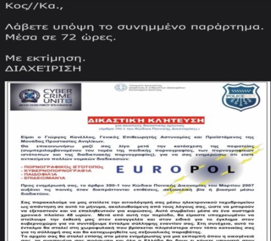 Στη συγκεκριμένη περίπτωση οι δράστες στην προσπάθειά τους να εξαπατήσουν συμπολίτες μας – χρήστες του διαδικτύου χρησιμοποιούν τα στοιχεία του Γενικού Επιθεωρητή Αστυνομίας Νοτίου Ελλάδας, Αντιστράτηγου Γεώργιου Κανέλλου, σε επιστολή που φέρει λογότυπα της Διεύθυνσης Δίωξης Ηλεκτρονικού Εγκλήματος, του Υπουργείου Δικαιοσύνης και ενημερωτικού ιστότοπου, επιχειρώντας να δημιουργήσουν την εντύπωση ότι προέρχεται από την Ελληνική Αστυνομία.