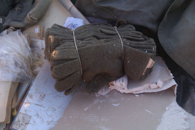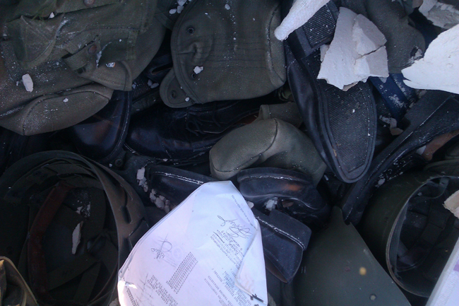 Και όλα αυτά είναι παλιά και ληγμένα; Οι καινούριες όμως στρατιωτικές αρβύλες και τα γάντια που ολοκληρώνουν την εικόνα, γιατί είναι πεταμένα; Έχει πολλά ο στρατός και δεν έχει πού να τα βάλει; Κι αν είναι έτσι, γιατί δεν τα «χαρίζει» σε κανένα κοινωνικό παντοπωλείο; Όλο και κάποιος θα τα έχει ανάγκη.