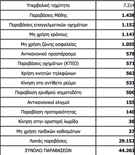 Από τις 19 Δεκεμβρίου έως τις 06 Ιανουαρίου συγκροτήθηκαν 7.122 συνεργεία ελέγχου, πραγματοποιήθηκαν 187.910 έλεγχοι σε οχήματα και βεβαιώθηκαν περισσότερες από 44.000 παραβάσεις.