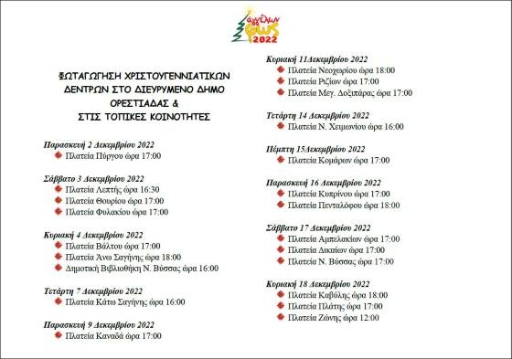 Το πρόγραμμα της φωταγώγησης των χριστουγεννιάτικων δέντρων για το 2022, στον Δήμο Ορεστιάδας και τις τοπικές κοινότητες, ανακοίνωσε η Δημοτική Κοινωφελής Επιχείρηση Πολιτιστικής Ανάπτυξης Ορεστιάδας.