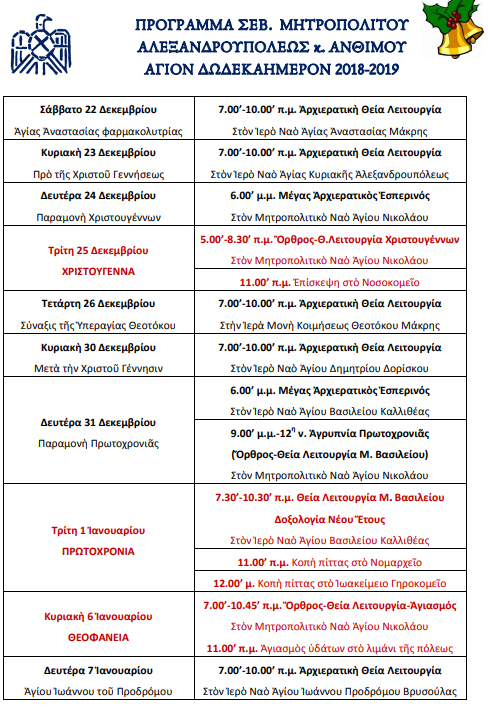 Το πρόγραμμα του Μητροπολίτη Αλεξ/πολεως Άνθιμου για το Άγιο Δωδεκαήμερο 2018-2019