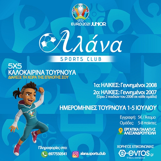 Ξεκινούν στις 30 Ιουνίου τα 2 ποδοσφαιρικά τουρνουά 5Χ5 EURO 2021 JUNIOR για μαθητές γυμνασίου που θα διοργανωθούν από 1-5 Ιουλίου 2021 στις εγκαταστάσεις της ΑLANA Sports Club.