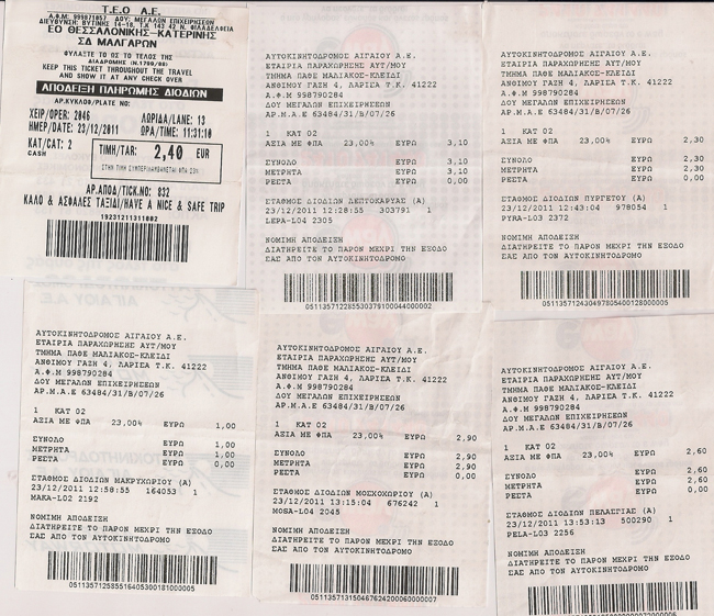 Στάση για καφέ στη Μουσθένη της Καβάλας, πάλι στο δρόμο και στις 11 και 7, διόδια στην Ανάληψη. Άλλα δύο ευρώ.