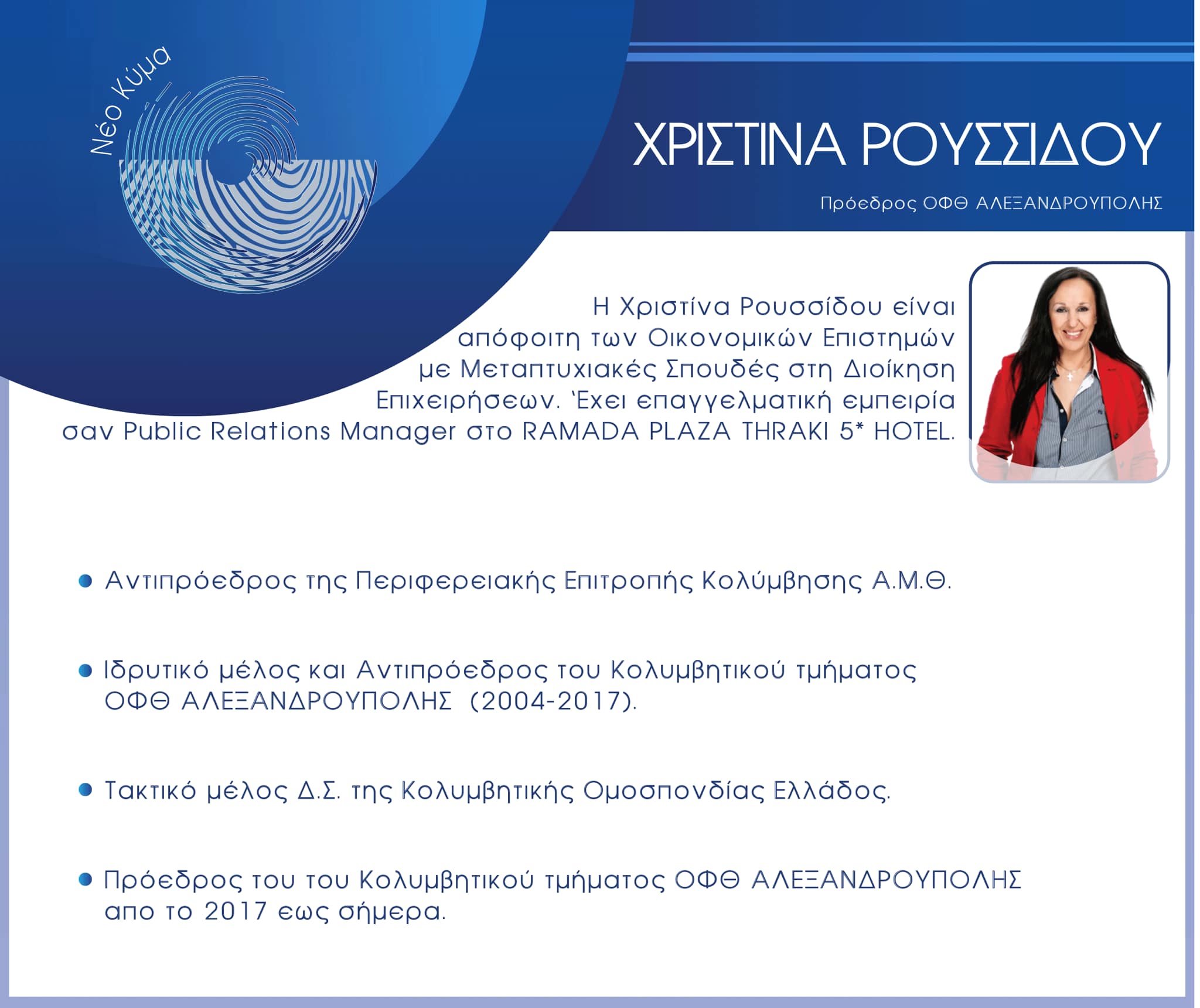 Η Πρόεδρος του ΟΦΘ Αλεξανδρούπολης, κ.Χριστίνα Ρουσσίδου κάνει το επόμενο βήμα και βάζει υποψηφιότητα με την παράταξη "Νέο Κύμα" με επικεφαλής το Σπύρο Γιαννιώτη.