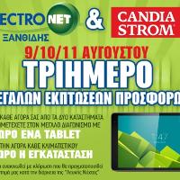 Τα καταστήματα ηλεκτρικών ειδών "Electronet ΞΑΝΘΙΔΗΣ" και "CANDIA STROM", θα μας προσφέρουν ένα 3ήμερο μεγάλων εκπτώσεων και προσφορών στις 9, 10 και 11 Αυγούστου, σε ΟΛΕΣ τις ηλεκτρικές συσκευές και σε ΟΛΑ τα στρώματα! Επίσης με κάθε αγορά κλιματιστικού, ΔΩΡΕΑΝ...