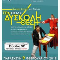 O Σύλλογος Καρκινοπαθών και Φίλων Ν. Έβρου ΣΥΝΕΧΙΖΩ παρουσιάζει σήμερα 9 Φεβρουαρίου στις 21:15, τη θεατρική παράσταση "Σε πολύ δύσκολη θέση» όπου είναι ο γενικός τίτλος της σπονδυλωτής αυτής παράστασης που αποτελείται από πέντε κωμικές ιστορίες, διηγήματα του Τσέχοφ, σε...