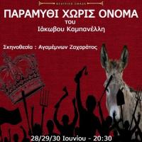 Η Θεατρική ομάδα «ΝΕΦΕΛΗΓΕΡΕΤΕΣ» συμπληρώνοντας 25 χρόνια προσφοράς και δημιουργίας στα πολιτιστικά δρώμενα της Αλεξανδρούπολης παρουσιάζει στις 28/29/30 Ιουνίου στις 20:30, στο Πνευματικό Κέντρο της Ι. Μ. Αλεξανδρούπολης το έργο του Ιάκωβου Καμπανέλλη «ΠΑΡΑΜΥΘΙ ΧΩΡΙΣ ΟΝΟΜΑ» σε σκηνοθεσία του Αγαμέμνονα Ζαχαράτου...