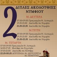 Ο Ιερός Ναός του Αγίου Ελευθερίου ανακοινώνει πως φέτος κατά τη διάρκεια της Μ. Εβδομάδος, εκτός του κανονικού προγράμματος που θα τηρηθεί, θα τελεστούν και δεύτερες ακολουθίες του Νυμφίου την Μ. Δευτέρα και την Μ. Τρίτη για όσους έχουν καταστήματα...
