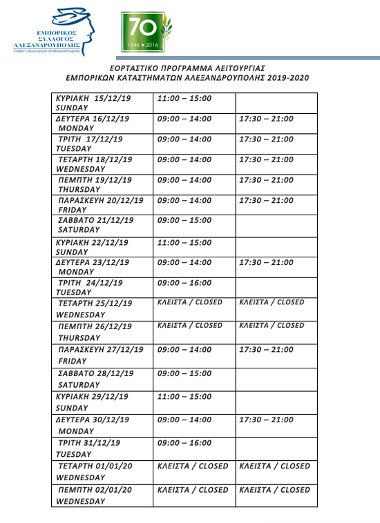 Dedeağaç (Aleksandrupolis) Ticaret Derneği yayınladığı açıklama ile mağaza ve dükkânlara noel ve yılbaşı öncesi önerdiği çalışma saatlerini duyurdu.