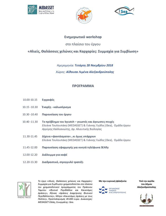 Το λιμάνι της Αλεξανδρούπολης αποτελεί τον επόμενο σταθμό των ενημερωτικών workshops που υλοποιούνται στο πλαίσιο του έργου «Αλιείς, Θαλάσσιες χελώνες και Καρχαρίες: Συμμαχία για Συμβίωση», με στόχο την ευρεία και σε βάθος ενημέρωση των αλιέων και άλλων εμπλεκόμενων φορέων πάνω στο πρόβλημα των τυχαίων συλλήψεων, που αποτελεί μία από τις κύριες απειλές για τη θαλάσσια βιοποικιλότητα, παγκοσμίως.