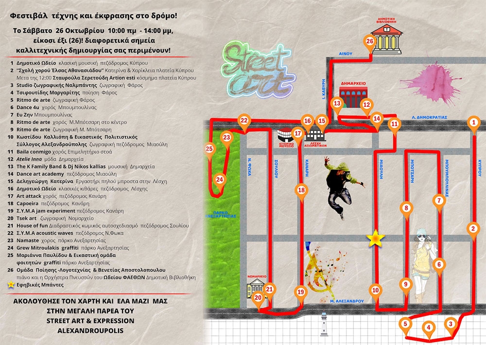 Ο Δήμος Αλεξανδρούπολης μαζί με καλλιτεχνικές ομάδες, συλλόγους και μεμονωμένους καλλιτέχνες, βγαίνουν στους πεζόδρομους της Πόλης, με χρώμα, ήχο, χορό και δημιουργούν για πρώτη φορά το Φεστιβάλ τέχνης και έκφρασης στον δρόμο!