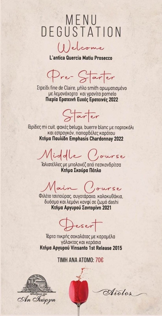 Το μενού έχει επιμεληθεί ο Chef Βασίλης Βασιλείου, ενώ τη λίστα των κρασιών ο Master of Wine Κωνσταντίνος Λαζαράκης.