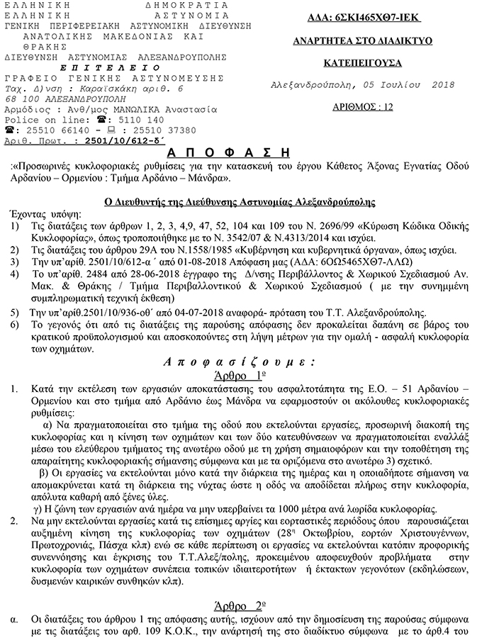Ξεκινούν οι εργασίες στο τμήμα Αρδάνιο – Μάνδρα – Επείγουσες κυκλοφοριακές ρυθμίσεις