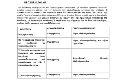 Συγκεκριμένα οι θέσεις αφορούν την εκτέλεση των αρχαιολογικών εργασιών του υποέργου 9 «ΑΡΧΑΙΟΛΟΓΙΚΕΣ ΕΡΕΥΝΕΣ ΚΑΙ ΕΡΓΑΣΙΕΣ» ΣΤΗΝ ΑΛΕΞΑΝΔΡΟΥΠΟΛΗ ΚΑΙ ΣΤΗΝ ΟΡΕΣΤΙΑΔΑ της πράξης ''Ανάπτυξη Δικτύων Φυσικού Αερίου Μέσης και Χαμηλής Πίεσης στην Περιφέρεια Ανατολικής Μακεδονίας-Θράκης'' για χρονικό διάστημα έξι μηνών από την ημερομηνία υπογραφής της σύμβασης, με δυνατότητα ανανέωσης ή παράτασης της σύμβασης έως τη λήξη του υποέργου, εφόσον κριθεί αναγκαίο από την εξέλιξη αυτού.
