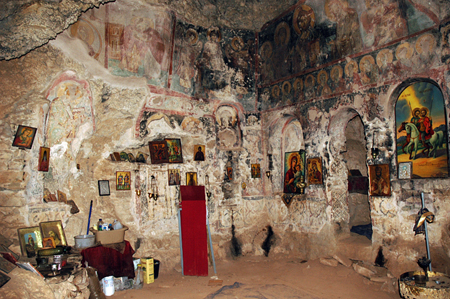 Στη σχηματιζόμενη από τον ποταμό Ειρήνης κοιλάδα περνά και η σιδηροδρομική γραμμή, σχεδόν δίπλα από το ποτάμι και κάτω από το σπήλαιο και ένθεν και ένθεν βρίσκονται πολλά άλλα σπήλαια! Σε ένα από αυτά τα σπήλαια είναι και το παρεκκλήσι των Αγίων Θεοδώρων με τοιχογραφίες που χρονολογούνται από τον 11ο και 13ο αιώνα.
