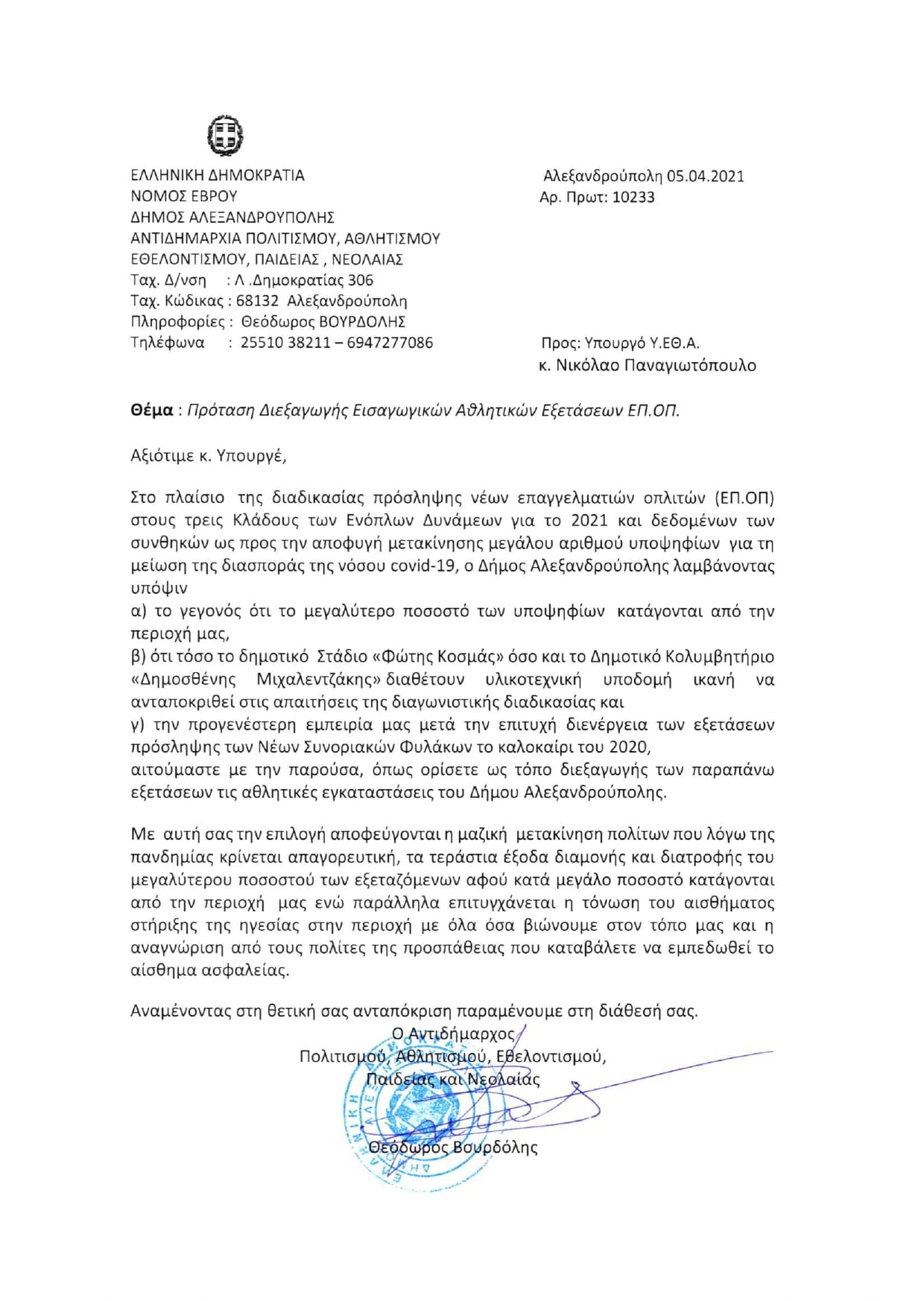 Βουρδόλης: "Οι αθλητικές δοκιμασίες των ΕΠΟΠ να πραγματοποιηθούν στην Αλεξανδρούπολη" - Τι αναφέρει στην επιστολή του προς τον Ν.Παναγιωτόπουλο