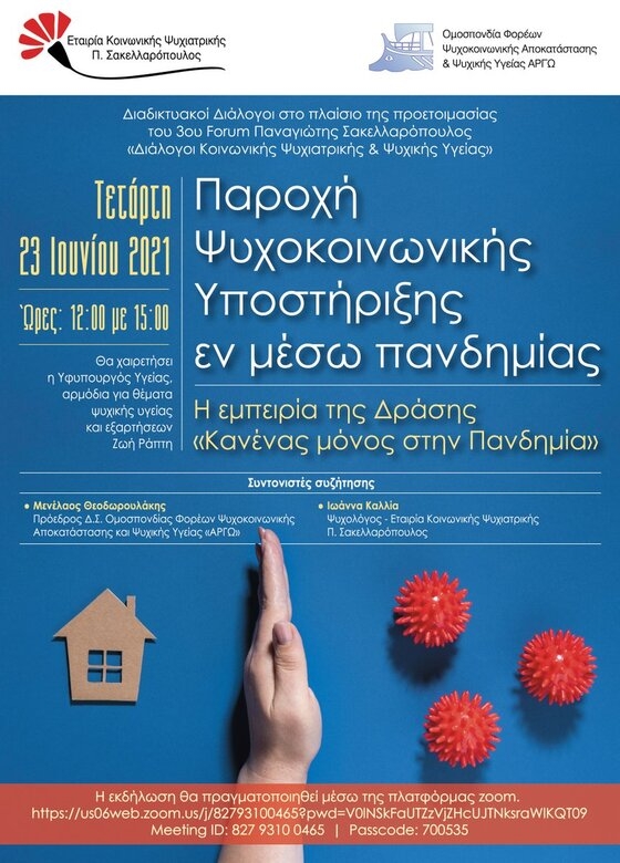 Η Εταιρία Κοινωνικής Ψυχιατρικής Π. Σακελλαρόπουλος σε συνεργασία με την Ομοσπονδία Φορέων Ψυχοκοινωνικής Αποκατάστασης και Ψυχικής Υγείας ΑΡΓΩ, διοργανώνουν διαδικτυακή εκδήλωση με θέμα: Παροχή Ψυχοκοινωνικής Υποστήριξης εν μέσω πανδημίας: