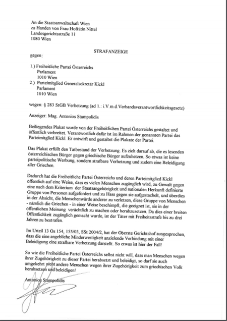 Μήνυση κατέθεσε ο Α. Σταμπολίδης, Εβρίτης που ζει και δραστηριοποιείται στην Αυστρία, στο κόμμα των Φιλελεύθερων FPO, γιατί το προεκλογικό πλακάτ του κόμματος προσβάλλει τους Έλληνες αλλά και τον ίδιο όπως αναφέρει προσωπικά.
