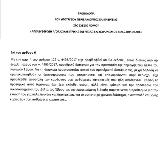 Κατατέθηκε εχθές στη Βουλή με πρωτοβουλία του Υπουργείου Περιβάλλοντος και Ενέργειας η τροπολογία που αφορά την επίλυση του προβλήματος των καλυβών στην περιοχή του Δέλτα του Έβρου.