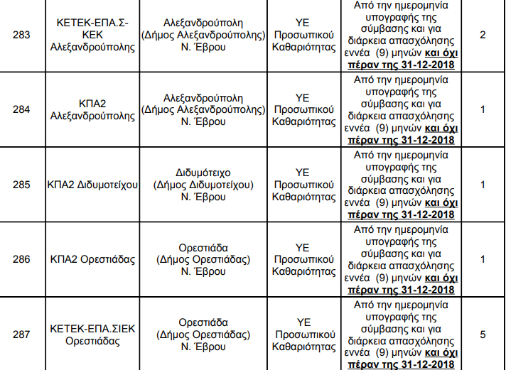 Η ανακοίνωση αφορά την πρόσληψη συνολικά τετρακοσίων εβδομήντα οκτώ ατόμων (478) 9/μηνης διάρκειας και όχι πέραν της 31-12-2018 (τετράωρη απασχόληση) για την αντιμετώπιση απρόβλεπτων και επειγουσών περιστάσεων καθαριότητας των κτιρίων του Ο.Α.Ε.Δ. εντός του Νομού Αττικής και των Νομών Αιτωλ/νίας, Αργολίδας, Αρκαδίας, Άρτας, Αχαΐας, Βοιωτίας, Δράμας, Δωδεκανήσου, Έβρου, Ευβοίας, Ευρυτανίας, Ζακύνθου, Ηλείας, Ημαθίας, Ηρακλείου, Θεσπρωτίας Θεσσαλονίκης, Ιωαννίνων, Καβάλας, Καρδίτσας, Καστοριάς, Κέρκυρας, Κιλκίς, Κοζάνης, Κορινθίας, Κυκλάδων, Λακωνίας, Λάρισας, Λασιθίου, Λέσβου, Λευκάδας, Μαγνησίας, Μεσσηνίας, Ξάνθης, Πέλλας, Πιερίας, Πρεβέζης, Ρεθύμνης, Ροδόπης, Σάμου, Σερρών, Τρικάλων, Φθιώτιδας, Φλώρινας, Φωκίδας, Χαλκιδικής, Χανίων και Χίου.