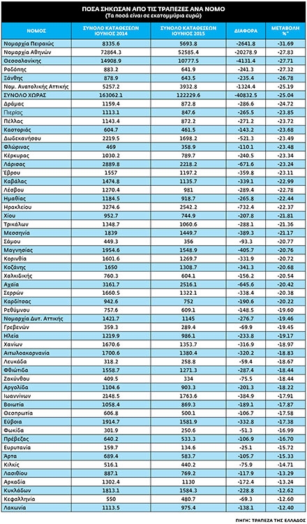 Τεράστιες ήταν οι διαφορές στις καταθέσεις των Ελλήνων, όπως προκύπτει από τα επίσημα στοιχεία της Τράπεζας της Ελλάδος σχετικά με τις τραπεζικές καταθέσεις ανα νομό από το διάστημα Ιουνίου 2014 με Ιουνίου 2015. Σε όλη την Ελλάδα οι καταθέσεις μειώθηκαν, με τον μέσο όρο εκροής καταθέσεων να ανέρχεται στο -25,04%, που σημαίνει οτι το 2015 οι Έλληνες κατέθεσαν 1/4 λιγότερα χρήματα απ' ότι το 2015.