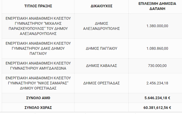 Με 60 εκατ. ευρώ πρόκειται να χρηματοδοτηθούν 58 έργα στο πλαίσιο της πρόσκλησης «Ενεργειακή αναβάθμιση Δημοσίων Κτιρίων – Δράσεις Ενεργειακής Αναβάθμισης και Εξοικονόμησης Ενέργειας (ΕΞΕ) και Αξιοποίησης Ανανεώσιμων Πηγών Ενέργειας (ΑΠΕ) σε Αθλητικές Εγκαταστάσεις» του Επιχειρησιακού Προγράμματος «Υποδομές Μεταφορών, Περιβάλλον και Αειφόρος Ανάπτυξη» του Υπουργείου Οικονομίας και Ανάπτυξης.