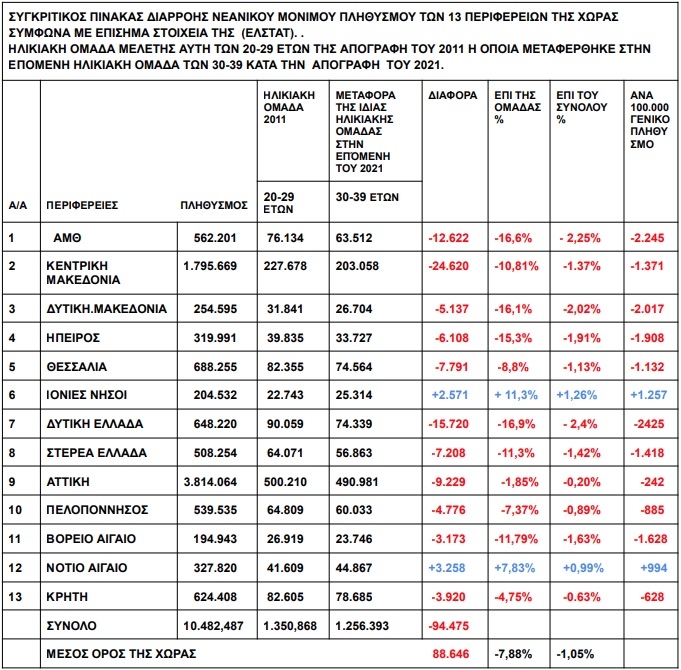 1. Η ηλικιακή ομάδα 20–29 ετών του 2011, όταν μεταφέρθηκε στην επόμενη ηλικιακή ομάδα 30–39 ετών το 2021, υφίσταται μαζική εξαφάνιση νέων στις 11 από τις 13 Περιφέρειες της χώρας, συνολικά κατα 94.475 άτομα.